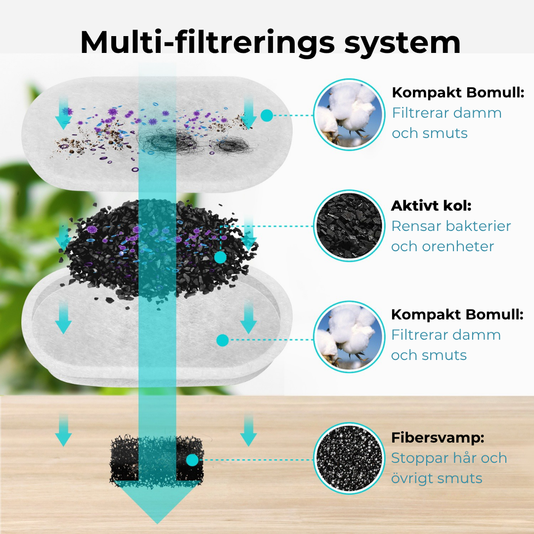 Utrustad med ett avancerat filtersystem som kombinerar aktivt kol, bomullsskikt och filtersvamp – allt för att effektivt ta bort lukt, hår, smuts och andra partiklar. Resultatet? Rent, friskt och gott vatten för din katt varje gång. Filter byts enkelt 1 gång i månaden.