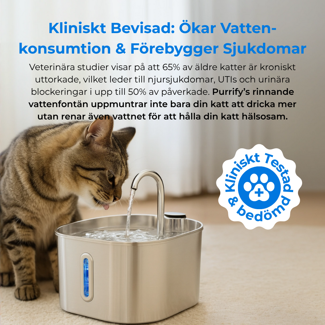 Purrify Pro är kliniskt bevisad att öka katters vattenkonsumtion och förebygga njursjukdomar.